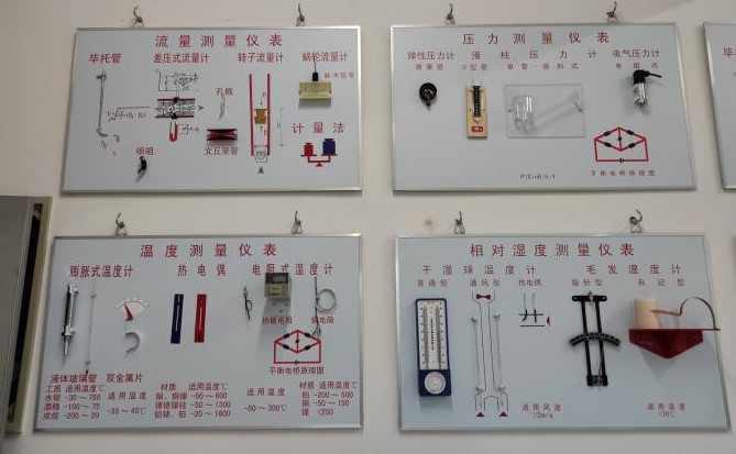 多種熱電偶等實(shí)物或模型組成,并在每類儀表下面畫(huà)有材質(zhì)和使用適用溫度范圍的表格和工作原理圖